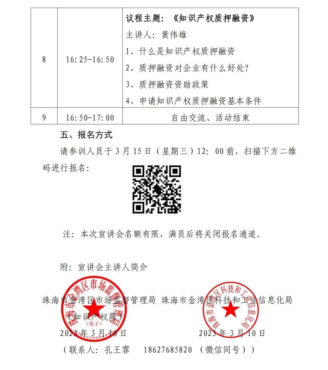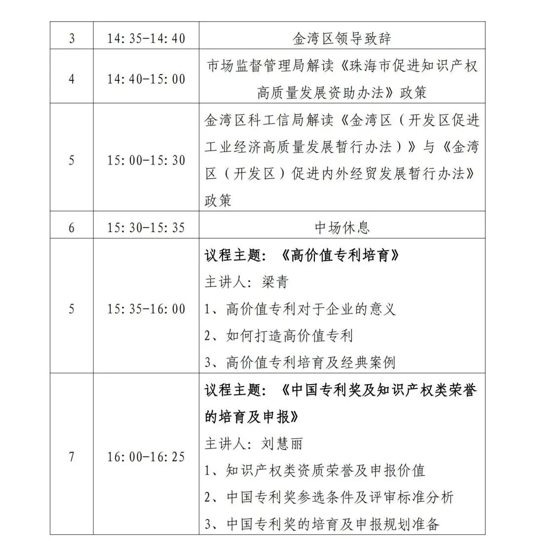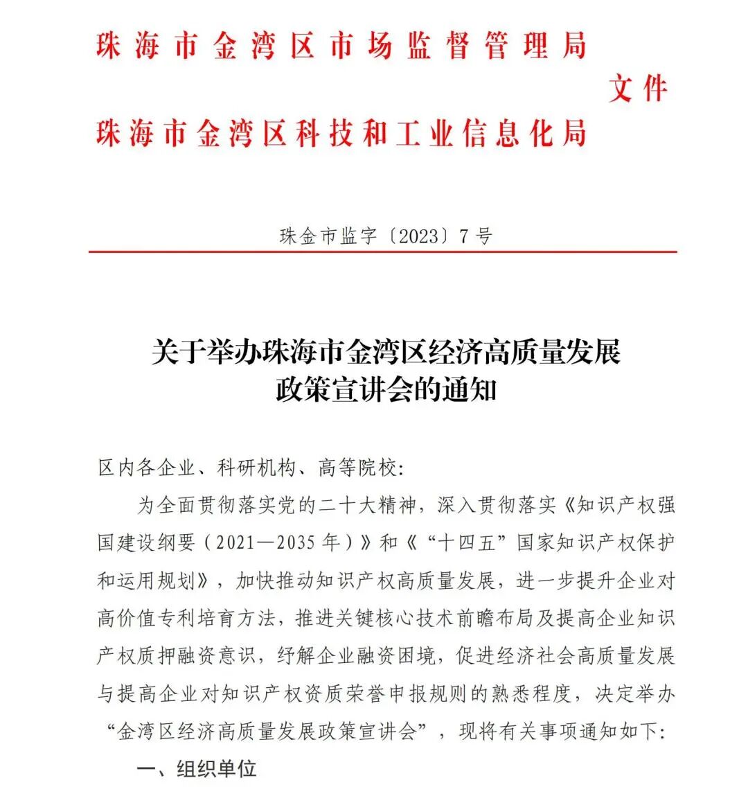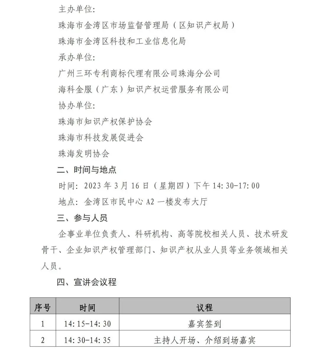为全面贯彻落实党的二十大精神,深入贯彻落实《知识产权强国建设纲要(2021—2035年)》和《“十四五”国家知识产权保护和运用规划》,加快推动知识产权高质量发展,进一步提升企业对高价值专利培育方法,推进关键核心技术前瞻布局及提高企业知识产权质押融资意识,纾解企业融资困境,促进经济社会高质量发展与提高企业对知识产权资质荣誉申报规则的熟悉程度,珠海市金湾区市场监督管理局决定在3月16日举办“促进经济高质量发展宣讲会”。 组织单位 主办单位 珠海市金湾区市场监督管理局(区知识产权局) 珠海市金湾区科技和工业信息化局 承办单位 广州三环专利商标代理有限公司珠海分公司 海科金服(广东)知识产权运营服务有限公司 协办单位 珠海市知识产权保护协会 珠海市科技发展促进会 珠海发明协会 时间与地点 时间:2023年3月16日(星期四)下午14:30-17:00 地点:金湾区市民中心A2一楼发布大厅 参会人员 企事业单位负责人、科研机构相关人员、技术研发骨干、企业知识产权管理部门、知识产权从业人员等业务领域相关人员。 宣讲会议程